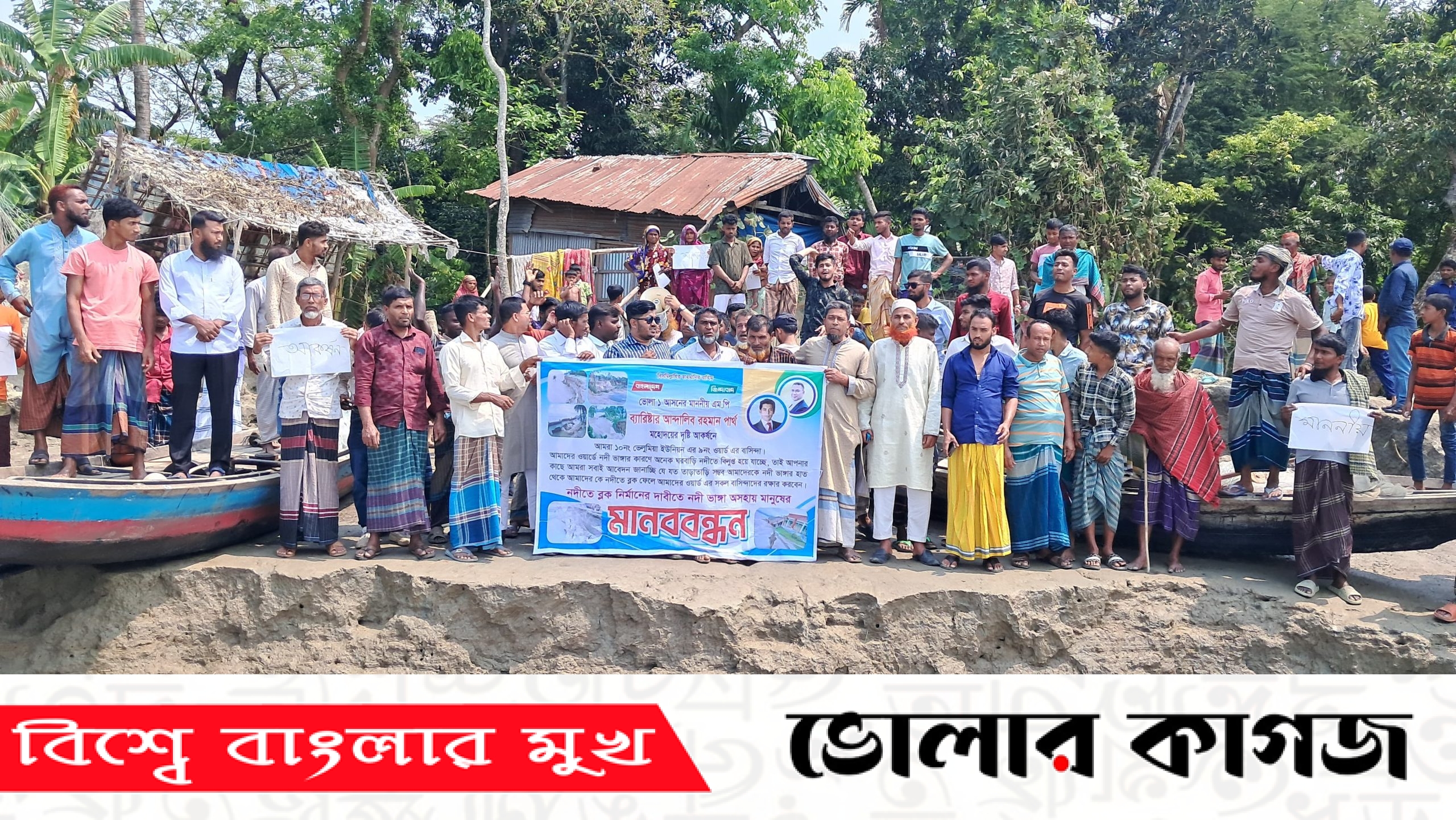 ভোলায় নদীর তীব্র ভাঙ্গনে ভিটেমাটি হারানোর হাহাকারে হারিয়ে গেছে ঈদের আনন্দ, ব্লকের দাবিতে মানববন্ধন