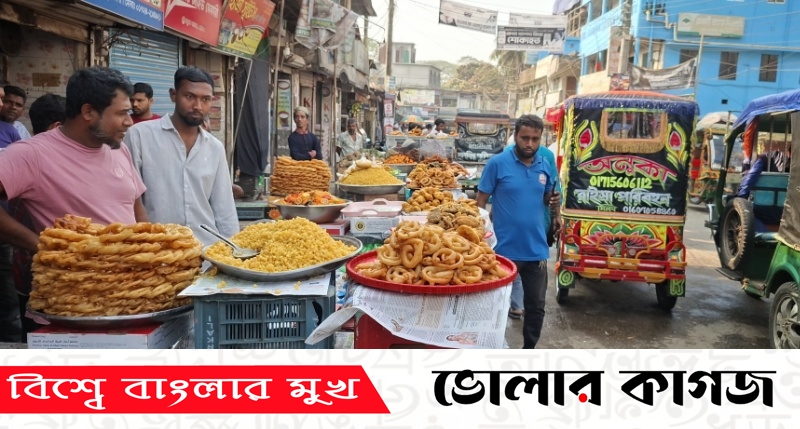 পবিত্র মাহে রমজানকে কেন্দ্র করে ভোলা শহরের বিভিন্ন সড়ক ও ফুটপাতে জমে উঠেছে ইফতার সামগ্রীর জমজমাট বেচাকেনা। তবে এসব ইফতার সামগ্রী বিক্রি হচ্ছে চরম অস্বাস্থ্যকর ধুলাবালির পরিবেশে। ধুলাবালি, যানবাহনের ধোঁয়া ও পথচারীদের ভিড়ের মাঝেই খোলা অবস্থায় রাখা হচ্ছে পেঁয়াজু, বেগুনি, জিলাপি, ছোলা ও অন্যান্য ভাজাপোড়া খাবার।